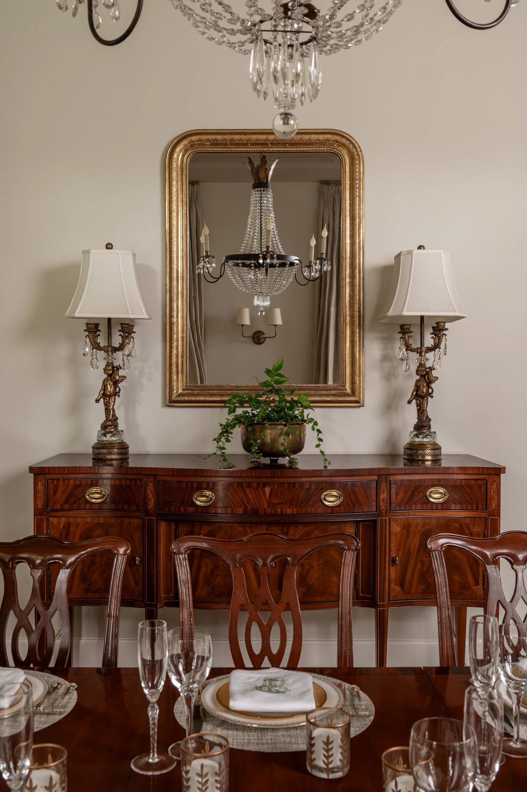 This kitchen works for real life β busy mornings and dinner parties alike. Everything is intentional. Appliances hide behind cabinet doors but stay plugged in, ready on cue. The marble island stays cool, perfect for rolling out dough. And the hutch next to the antique table holds years of collected tableware that make any meal feel special.